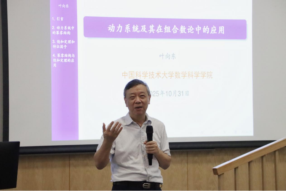 叶向东院士以组合数论中一个简单而有趣的“染色问题”为引,深入浅出地展开了主题讲座——“动力系统及其在组合数论中的应用”。他从动力系统的基本概念和发展历程出发,系统介绍了动力系统方法在组合数论研究中的独特作用与深刻联系,并阐述了动力系统中幂零结构这一正在不断发展的重要理论。讲座过程中,他详细介绍了组合学、数论、遍历理论与动力系统之间的内在联系,指出这些看似分属不同方向的数学分支其实紧密相关、彼此启发,并不断强调许多数学分支都可以应用于数论研究。同时,他分享了自己在动力系统相关领域的最新研究成果,提出了若干前沿且富有挑战性的问题,并展示了组合数论中重要的Erdös-Turan猜想。这些内容开拓了师生的学术视野,激发了对相关研究问题的深入思考。为现场师生提供了广阔的研究视野与学术启发。