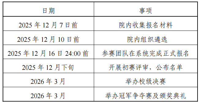 备注:赛程期间将开展创新创业训练营(选拔培育决赛项目),邀请校内外专家进行指导,具体安排以后续通知为准。