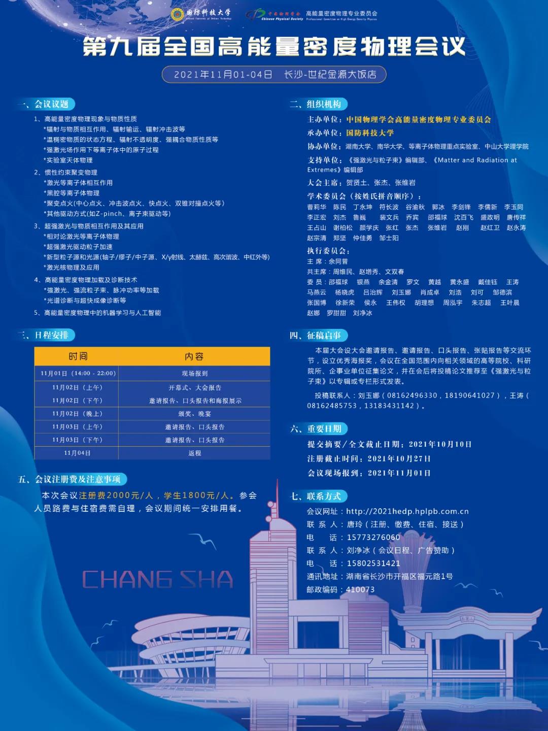 由中国物理学会高能量密度物理专业委员会主办,国防科技大学承办、湖南大学、南华大学和中山大学理学院等协办的第九届全国高能量密度物理会议将于2021年11月1日至4日于湖南长沙召开。